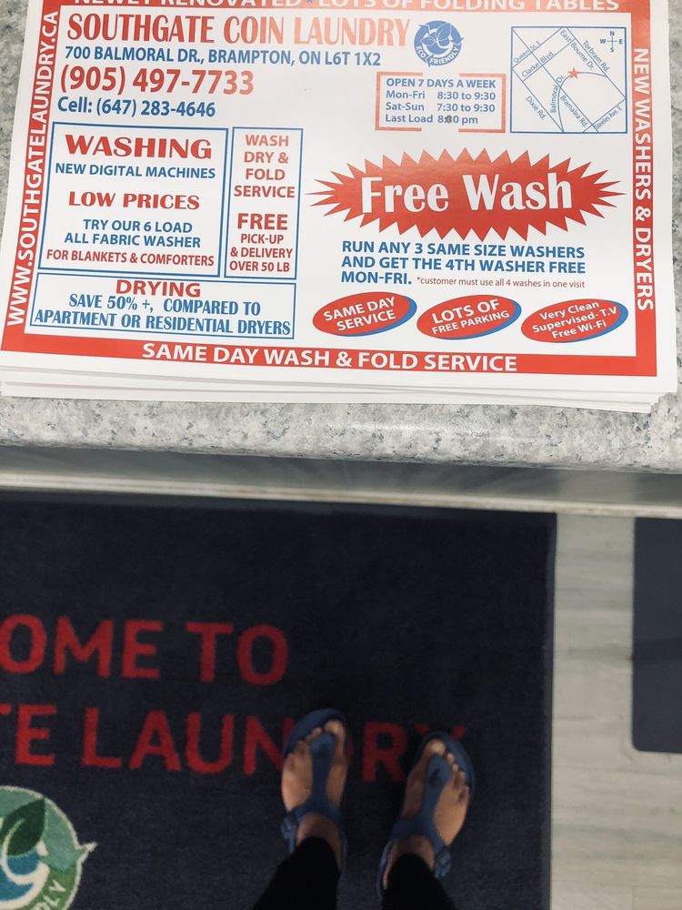 Southgate Coin Laundry in Brampton, Ontario. Telephone: 905-497-7733 or After Hours: 647-283-4646 SOUTHGATE COIN LAUNDRY - Wash & Fold Service - Self Service - Brampton's Cleanest Coin Laundry - ECO Friendly.