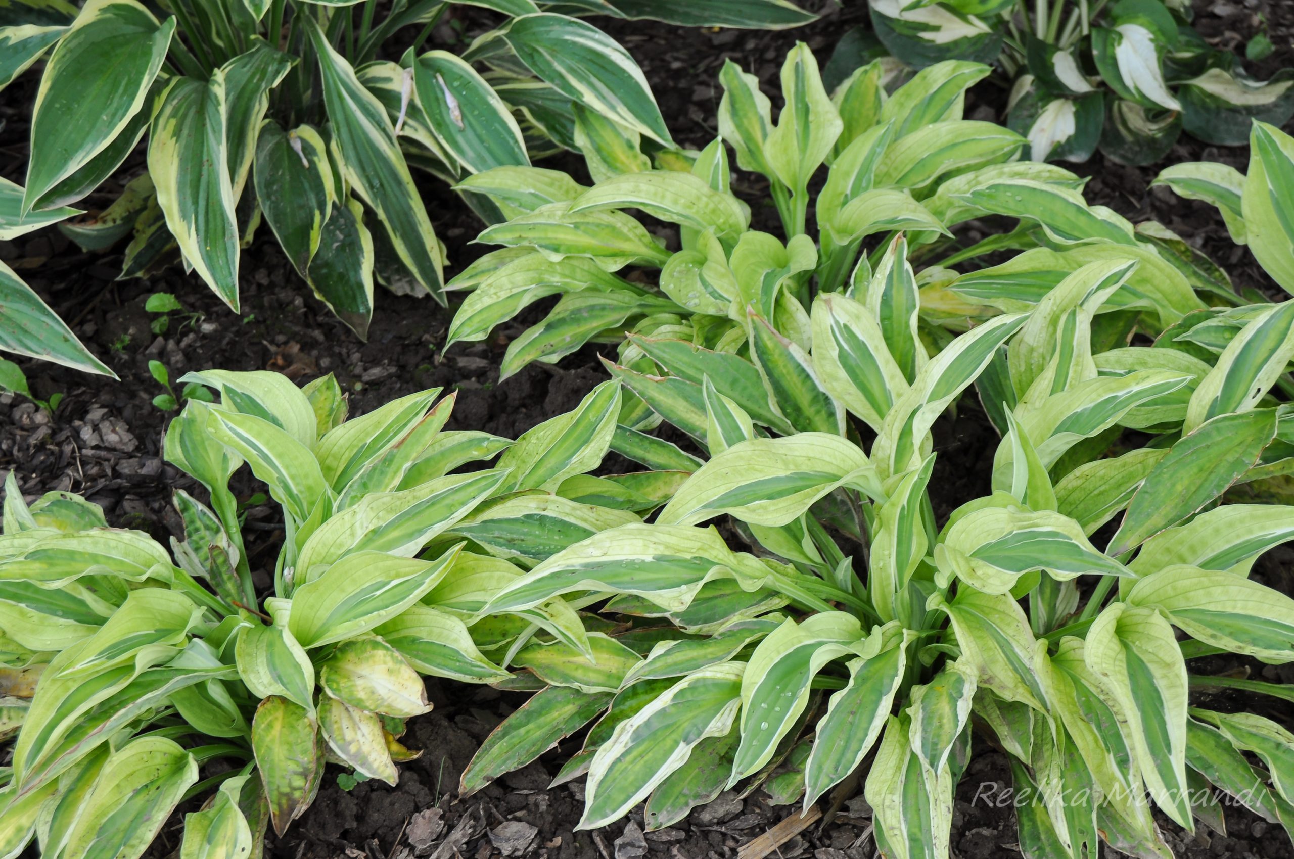 Plant number: 1.710.800. Hosta are among the most popular of perennials for shady areas, with hundreds of varieties now readily available. Plants form a sturdy mound of foliage, topped with lily-like blooms. This small selection has cupped, green leaves with bright yellow margins, dark green centres and white streaks in between.