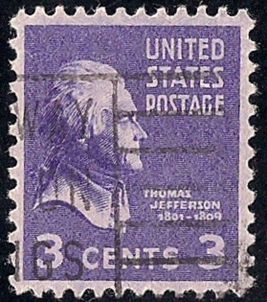 3-cent Thomas Jefferson single. The purple 3-cent value of the 1938 Presidential Series features an image of Thomas Jefferson (1743-1826), one of the most influential founders of the United States and the nation's third president (1801-09). A bust on display in the Congressional Library inspired the stamp's vignette.