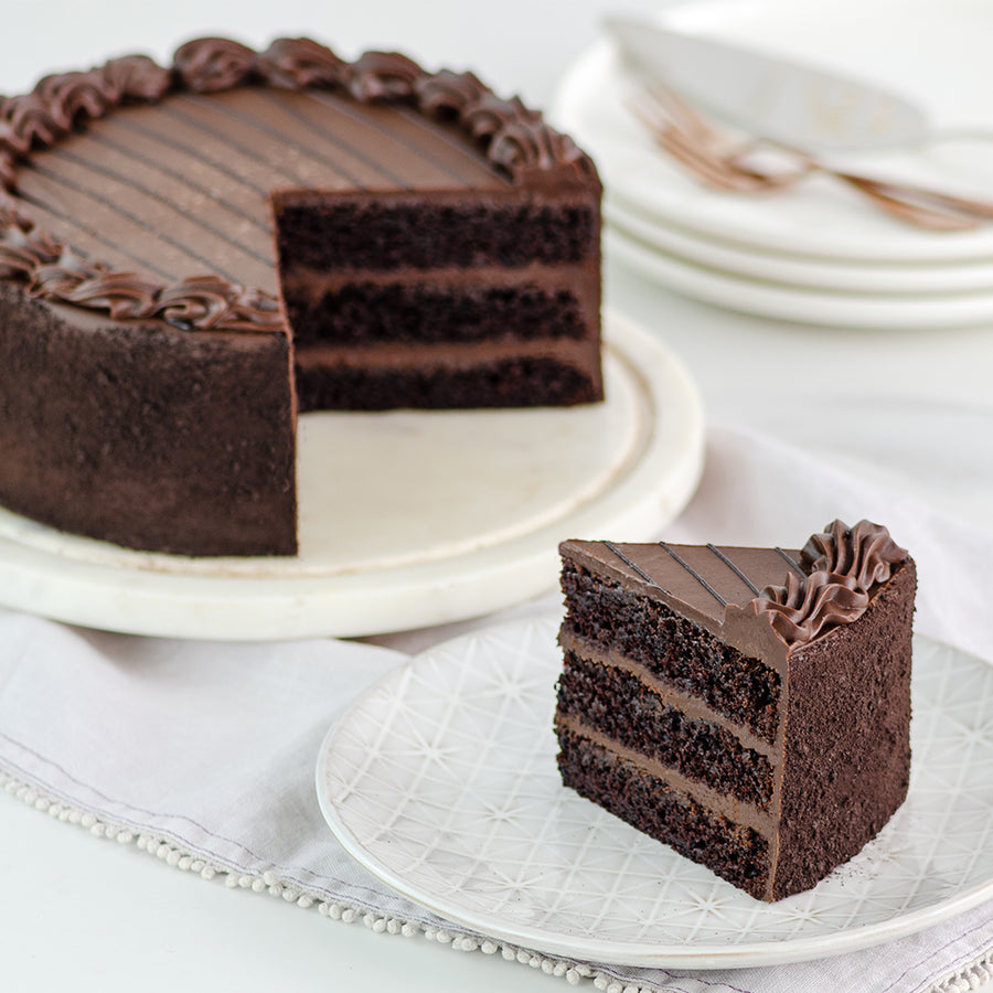Chocolate Fudge Cake. $28.00. Size. Chocolate Message Plaque. Quantity. Add to cart. For the true chocolate lover! Three layers of decadent chocolate fudge and chocolate devil's food cake topped with chocolate fudge and chocolate ganache. Contains: Egg, Milk, Soy, Wheat.