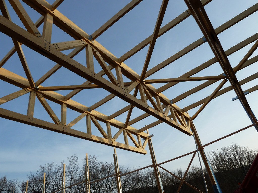 Construction d’un centre sportif charpente poutres treillis en bois lamellécollé. SEDIME